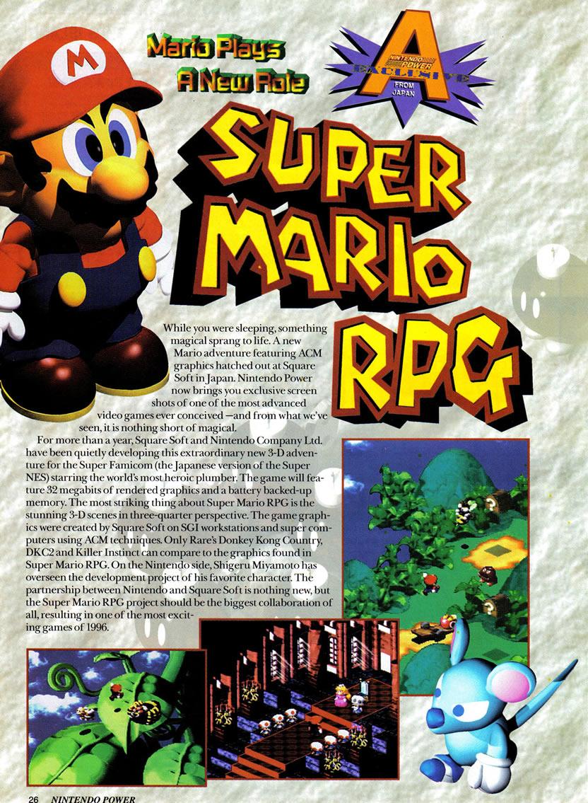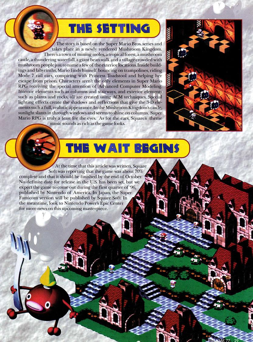 An article on Super Mario RPG from Nintendo Power Magazine Vol. 77 giving a preview of Mario's first RPG title and its revolutionary ACM graphics engine as well as background information on the story, characters and setting for the game.