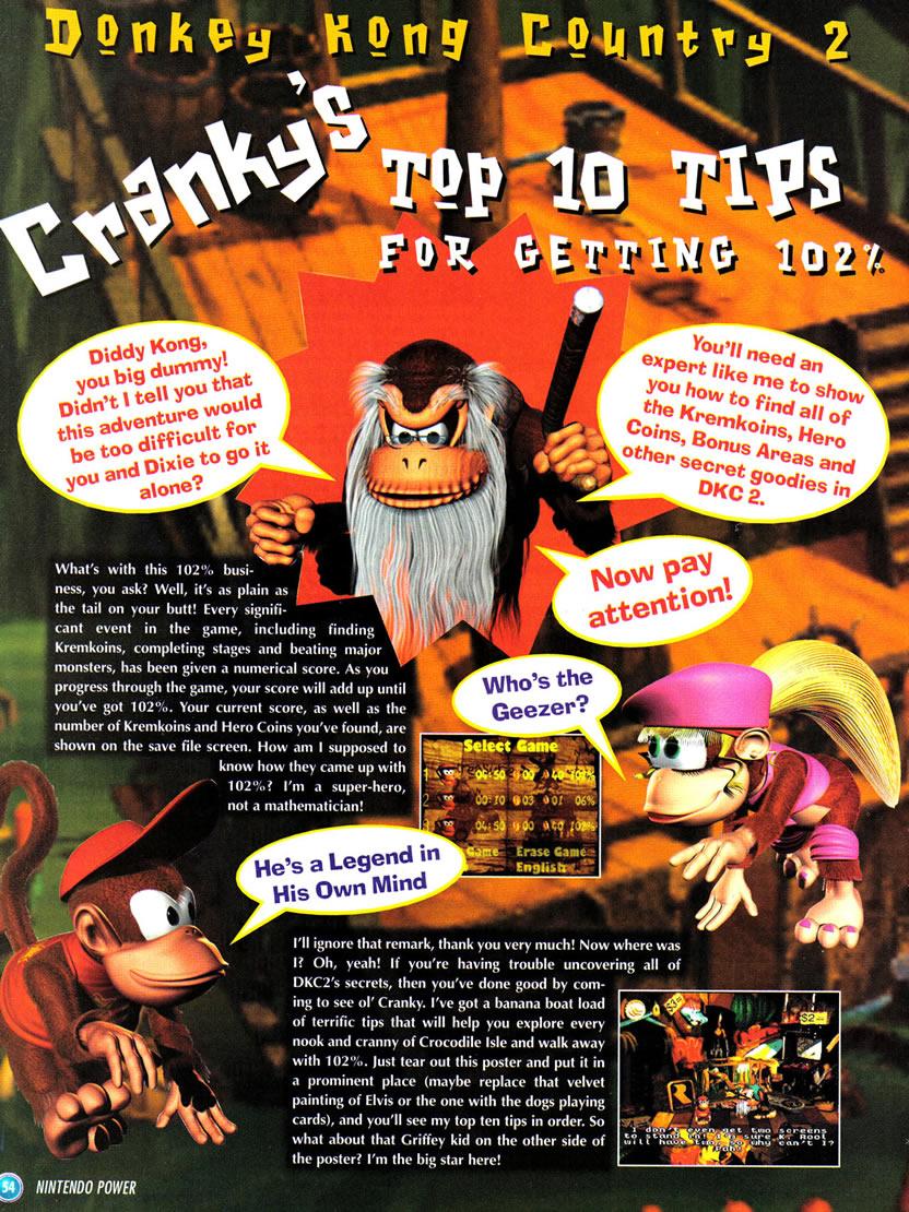 Some disgruntled chimp gave some of the best tips and info you might need to achieve 102% in Donkey Kong Country 2 in the February 1996 edition of Nintendo Power Magazine.